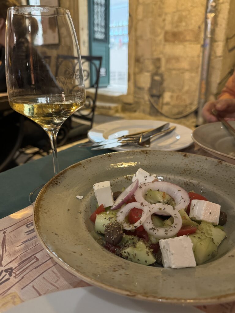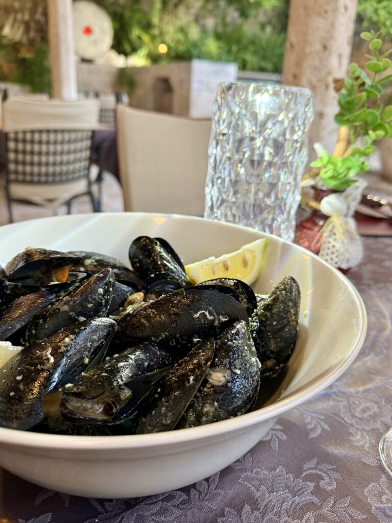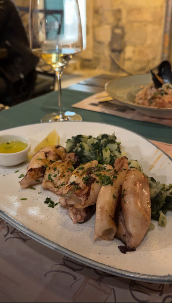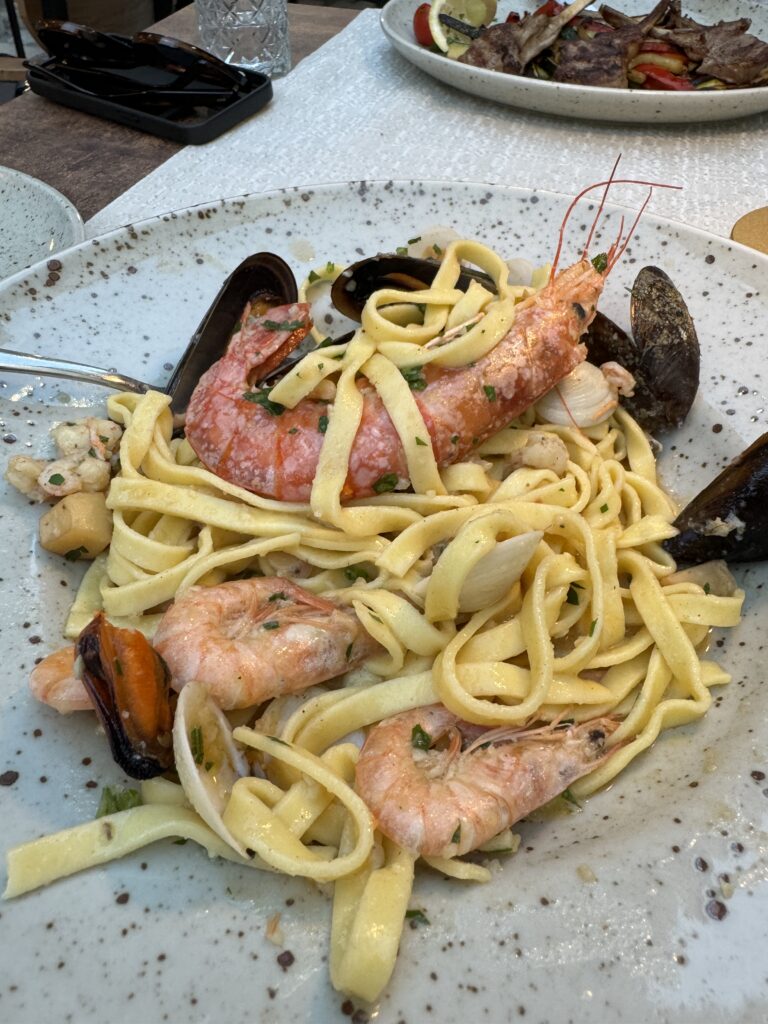 W mojej podróży postawiłam na klasykę – makaron z owocami morza w sosie na bazie wina i oliwy. To połączenie delikatności makaronu z intensywnością smaku owoców morza i aromatu świeżych ziół, podkreślone nutą białego wina i oliwy, sprawia, że to danie jest prawdziwym wyrazem harmonii smaków i kunsztu kulinarnej sztuki. Dla mnie niepotrzeba absolutnie nic więcej. Do tego schłodzone wino i jestem przeszczęśliwa.