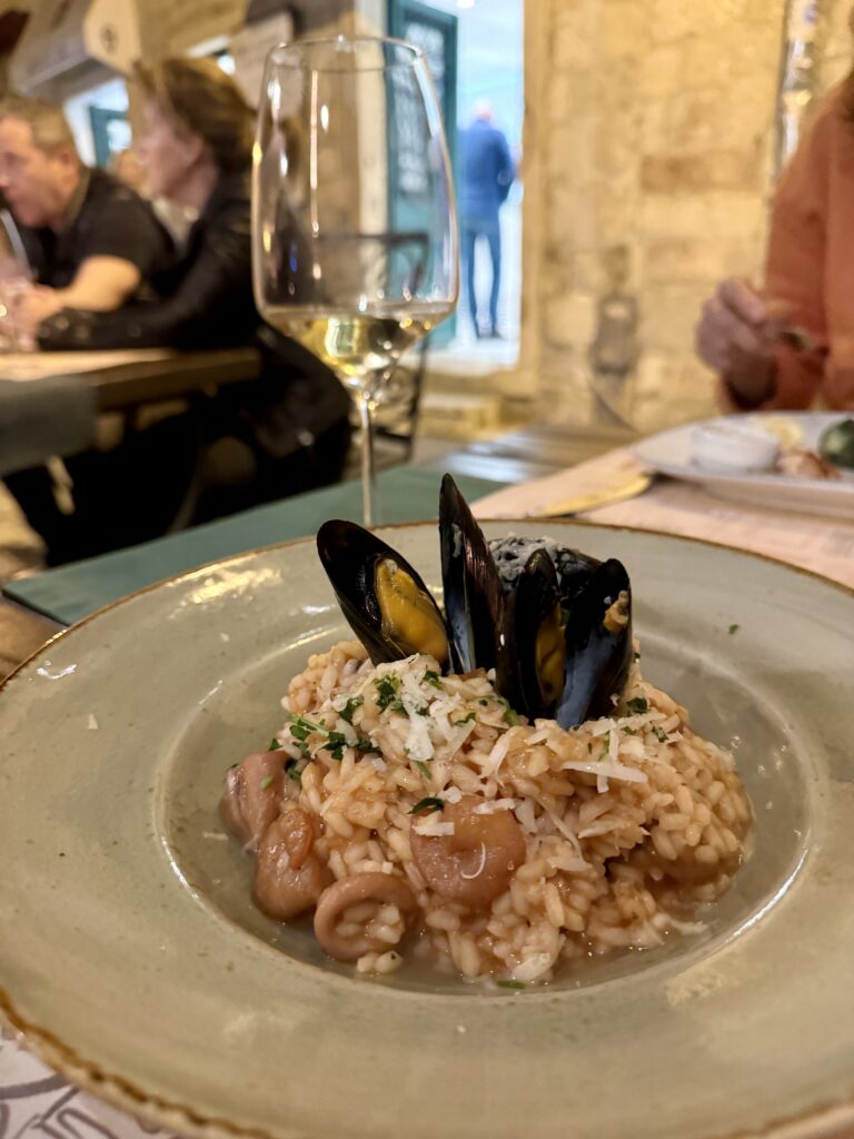 To, co sprawia, że to danie jest tak wyjątkowe, to użyte składniki – sepie, czyli kałamarnice, które nadają risotto charakterystyczną, ciemną barwę, oraz aromatyczne dodatki, takie jak czosnek, cebula, pietruszka i białe wino, które nadają mu głęboki i wyrazisty smak. Dodatkowo konsystencja jest niezwykle przyjemna dla naszego podniebienia. Musz przyznać, że risotto z sepią, które jadłam w Chorwacji, było zdecydowanie smaczniejsze niż te które jadłam we Włoszech. Dużo stracicie nie próbując go podczas pobytu.