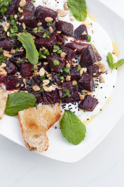 7. Pieczone buraki na ziołowym jogurcie z czosnkiem i orzechami