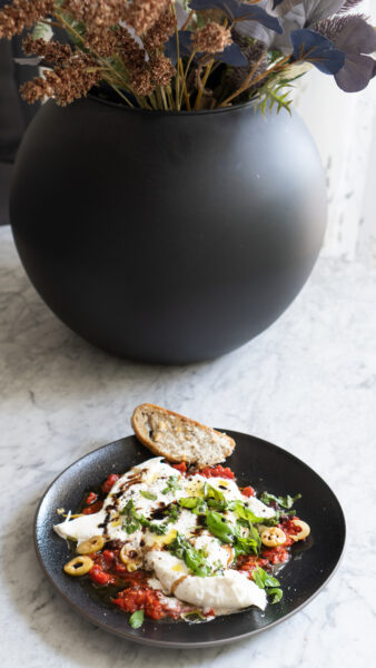 17. Kremowa burrata z pieczoną papryką, bazylią i balsamico