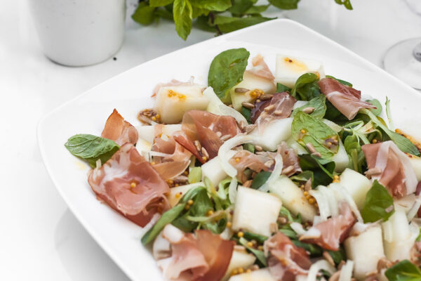 25. Sałatka z szynką parmeńską, melonem i miętą