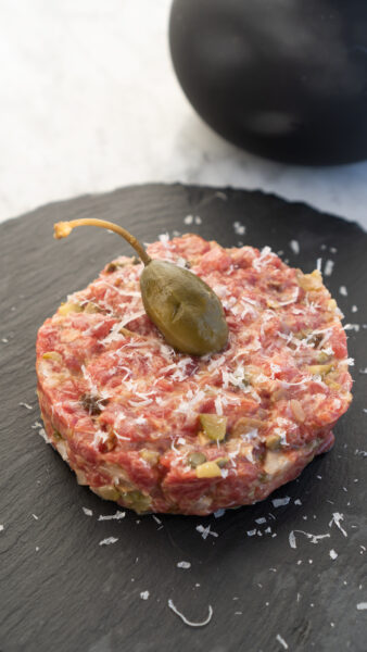 18. Siekany tatar wołowy z majonezem, parmezanem i anchois