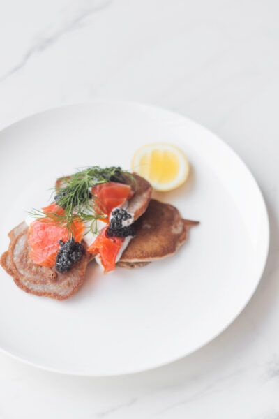 14. Rosyjskie bliny gryczane z kwaśną śmietanką, kawiorem i łososiem – kliknij po przepis