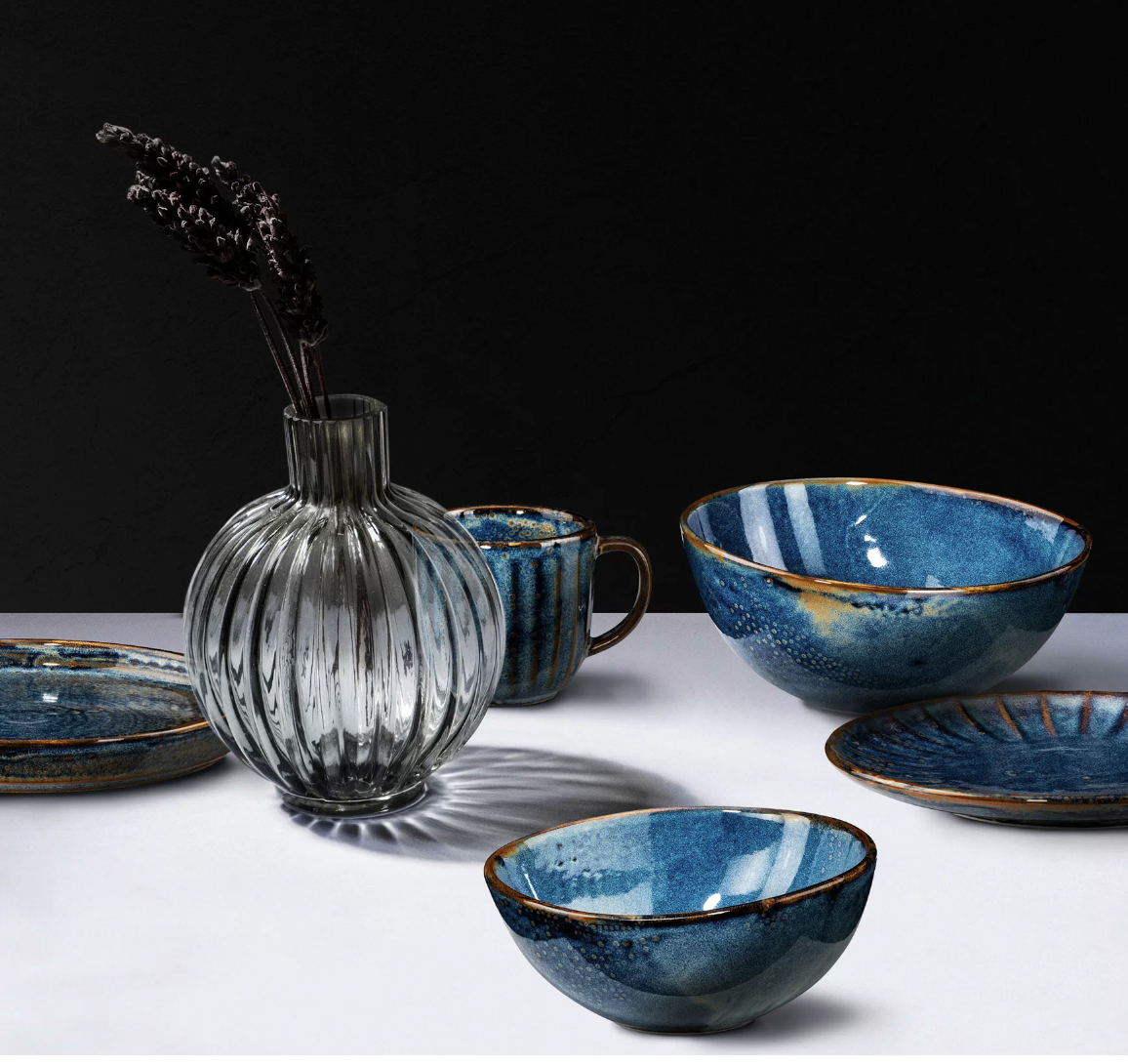 Dwudziestoelementowy zestaw porcelany w modnych odcieniach niebieskiego, który zdobył ogromną popularność wśród entuzjastów nietuzinkowego wystroju wnętrz.