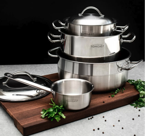 Solidność oraz użytkowy komfort to cechy wyróżniające produkty marki TOMGAST, stanowiące doskonały wybór dla branży gastronomicznej. Ich eleganckie wykończenie sprawia, że świetnie prezentują się w otwartych kuchniach. Powstały one w wyniku połączenia najwyższych standardów użytkowych. Wykonane z jednego kawałka stali nierdzewnej 18/10, posiadają zgrzewane uchwyty oraz wielowarstwowe dno, które perfekcyjnie przewodzi ciepło. Dodatkowo, garnki objęte są 5-letnią gwarancją.